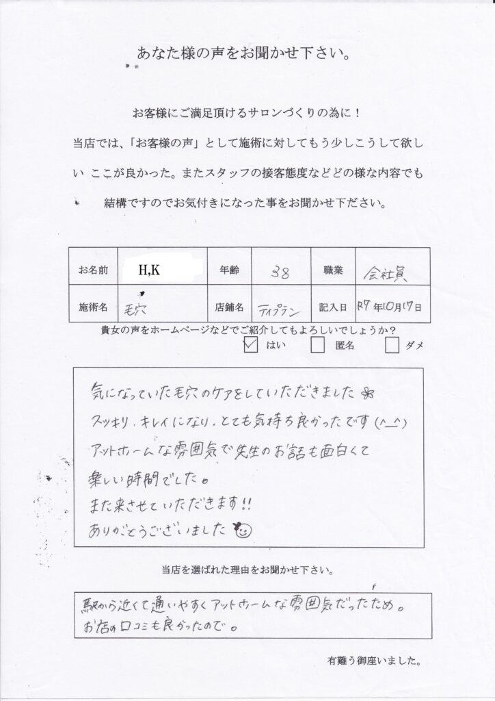 お名前 H、K 年齢38歳 職業 会社員