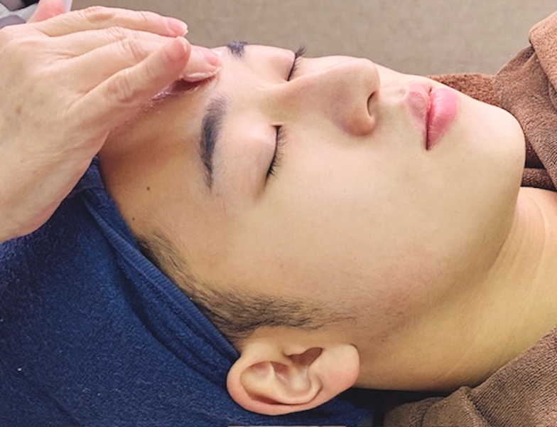 お顔のマッサージの後、沈静パックお肌の大掃除により美容成分を深部まで作用しますお肌がツヤツヤ♪ 日焼け止めを行い紫外線対策をしっかりします。