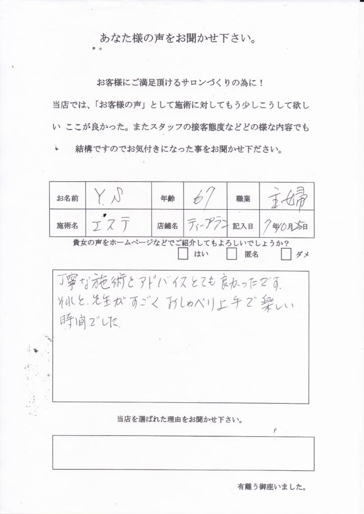 あなた様の声をお聞かせ下さい お名前 Y,S 年齢67歳 職業主婦 施術名 エステ 店名 ティプラン 記入日 令和7年10月25日 丁寧な施術とアドバイスとても良かったです。 それと先生がすごくおしゃべり上手で楽しい 時間でした 癒しエステ|おしゃ...