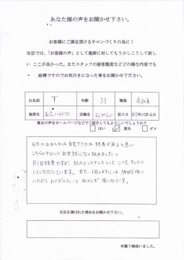 お客様の声 月1回の毛穴ケア 【あなた様の声をお聞かせ下さい】 お名前 T 年齢33歳 職業 会社員 施術名 毛穴ハイドロ 店名 ティプラン 記入日 令和7年10月26日 毛穴のお手入れは自宅ケアでは限界があると思い こちらのサロンにお世話になり始... -